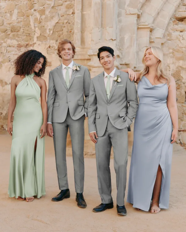 It's common for brides to choose the palette for their bridesmaid dresses before the rest of the wedding party. Our rule of thumb is to pair tan groomsmen suits with pastel or lighter toned bridesmaid dresses (especially for spring and summer weddings!), light gray groomsmen suits for both pastel and slightly dustier tones, like Eucalyptus or Twilight. Our darker toned groomsmen suits, like navy, charcoal, and black pair well with jewel tones and moodier bridesmaid dresses. Black groomsmen suits and tuxedos particular also pair well with neutral bridesmaid dress colors, like champagne, navy, or black, for black tie weddings. The first step to choosing the right suit color is to order free swatches (for both groomsmen suits and bridesmaid dresses!) and see them side-by-side IRL before committing. You can always get 3 free bridesmaid dress swatches and a free groomsmen suit swatch book anytime.