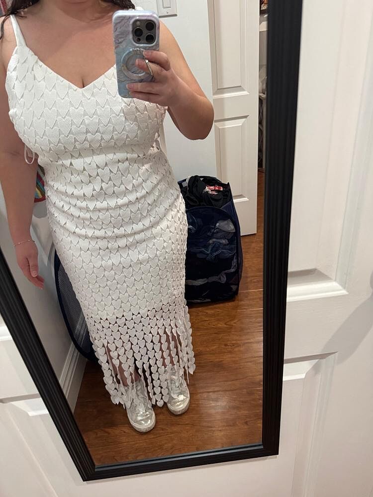 wearing this for my reception dress! i love it so much. it’s so unique and fun. looks just like the photo. i’m short so the fringes go all the way to the floor but it still looks super cute
