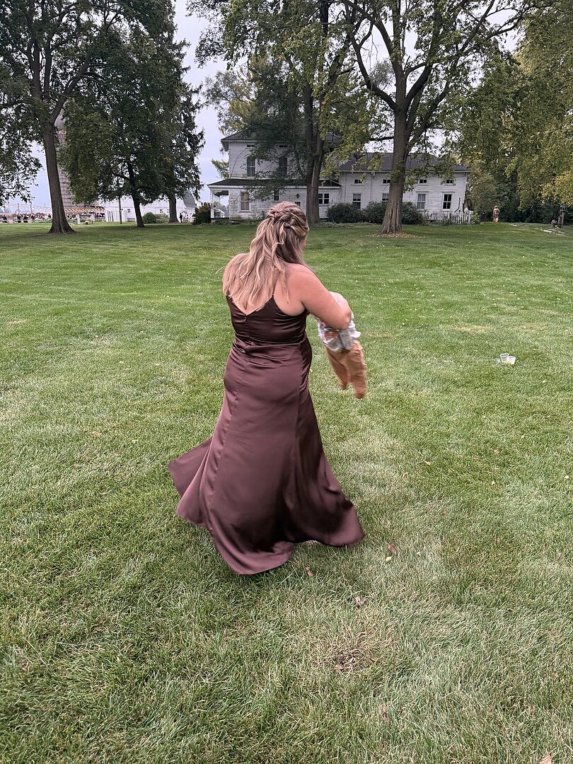 I picked this dress because I wanted to be comfortable. The style was simple, but classy. I am insecure of my "mom pooch", but wanted a style to fit and show my waist line; the ruching on the side did just that. Loved having the adjustable straps! My hips measurement sized for XL (41 inches), everywhere else measured L. I actually purchased both XL and L due to time crunch. The L fit like a glove. Did just small amount of hemming on the length.