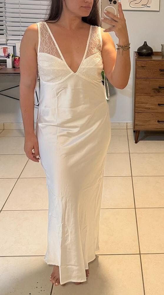 Don't have "something borrowed" to get ready in? This white slip dress with sequin lace shoulders has tons of vintage charm.