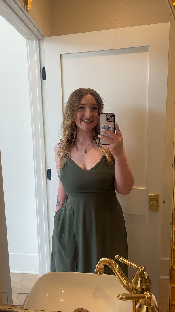 Beautiful Dress. I loved that the dress also had pockets to keep my belongings during the reception. I did however order a dress that was entirely too big. I paid $23 to get 6in taken off from the lower back bottom flow piece, but it was beautiful. I got so many compliments on the color, the fit, as well as the flowy fabric on the spaghetti straps.