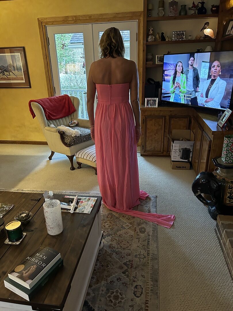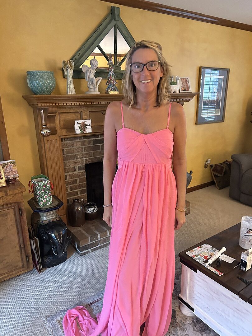 I love this dress and the color and quality of fabric. Size 10 fits good- although I can wear an 8, it was definitely best to go with 10. The only thing is that it slides a little up top because I’m not very busty but the little straps are a life saver!